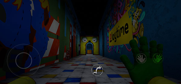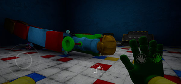3、醒来出现在一个陌生的世界,这里有很多玩具,左下角按钮可以操纵角色自由移动,右侧代表左右手掌,便于拾取物品,目前只能使用绿色手掌。