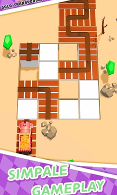 《黄金运输》是一款以拼图闯关形式实现道路畅通的游戏。玩家需通过移动拼图来清理道路,此前混乱的道路经清理后,火车便能快速通行。不断重复清理道路与调整路线的操作,待所有道路拼接完成,一条宽阔的行驶道路就会形成,如此,运输黄金的任务便能轻松达成。