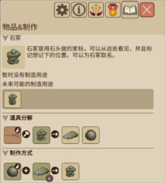 以石冢为例,进入其物品与制作界面后,名字下方的内容便是该道具的用途说明。石冢是由石头制成的家标,能从远处被看到,起到标记位置的作用,还可以为它取名。而未来用途里的图标,意味着若要制作新的石冢,就需要以当前这个石冢作为原料。