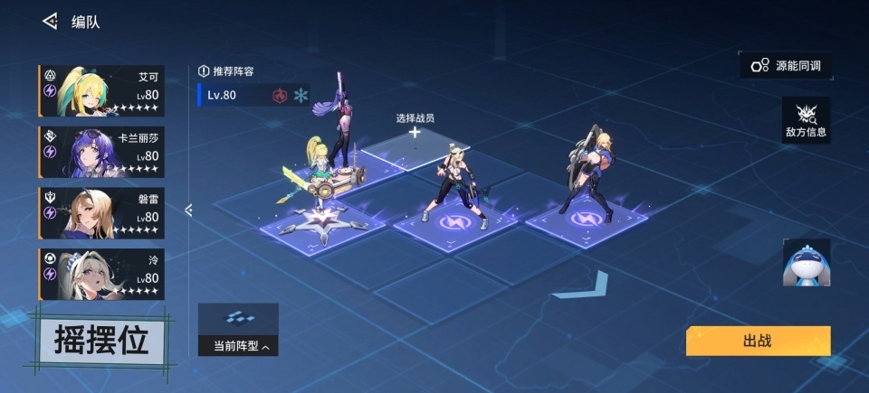 该阵容由核心C卡兰丽莎+泠【专武提供高额双爆,压血线】+艾可【提供高额攻击,暴击】+磐雷【提供高额无视防御】+摇摆位。