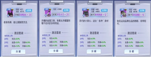 轻装上阵:在《校花梦工厂》里,轻装上阵套装是最基础的套装之一,它的属性较为均衡,适合所有角色使用,是前期过渡阶段非常实用的装备。