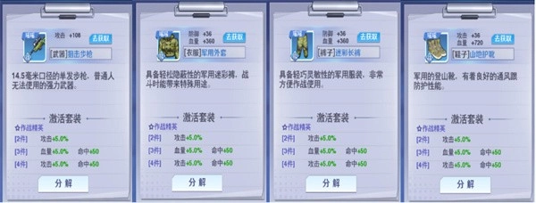 整个装备系统以套装属性为轴心展开,游戏套装分别分为:轻装上阵、作战精英、超能战姬、暗夜魅影、圣谕救赎。