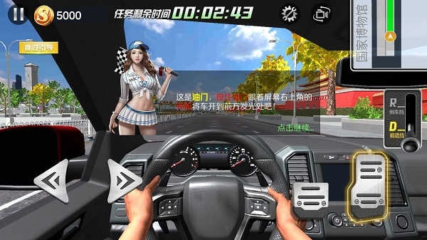 1、下图中所展示的是油门踏板,按住油门跟着屏幕右上角的导航将车开到前方发光处。