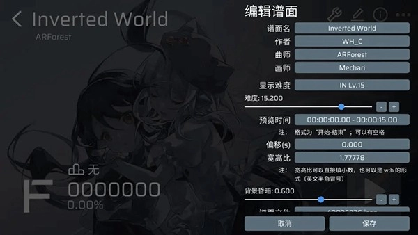 点击铅笔形状的图标后,屏幕右侧会弹出谱面设置界面,在该界面中能够调整谱面定数、宽高比以及Tip等参数,建议根据自身需求进行调节(调整后请记得保存设置)。