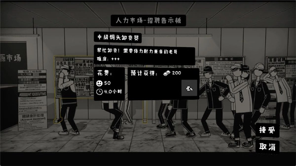 2、玩家得去游戏里的人力市场,接各种“打工”小游戏来做。这些“打工”小游戏在耗时长短、任务难度和能拿到的报酬上都有差异,玩家得好好挑选一番才行。要是去得迟了,人力市场里那些不错的“日结”工作可就没啦!