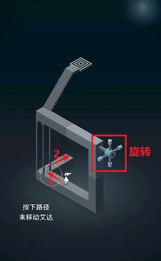 5、先转动阀门,使艾达到达台阶处,旋转阶梯让艾达进入通道,再次旋转让艾达踏上机关。艾达返回通道后再次操作旋转,让艾达来到触发机关所在的通道,艾达走上该通道后再次旋转,将艾达带到门前。5.1.2.3