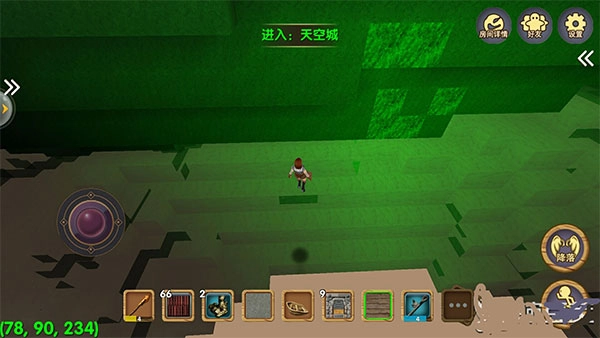 游戏左下角设有坐标显示,当最后一个坐标值接近200时,玩家便抵达天空城。这座空中之城遍布新奇事物:白天仅有小动物出没,夜幕降临后,形形色色的大型怪物便会现身。不过这类现象多见于普通模式,在创造模式中,玩家几乎很难遭遇怪物——毕竟在此模式下,玩家拥有如同上帝般的权限。