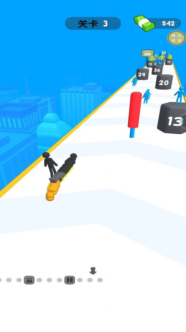 《枪械超进化》是一款卡通风格的休闲跑酷闯关游戏。玩家将操控角色完成跑酷任务,在关卡中灵活规避各类障碍物,尽可能收集增益技能,率先抵达终点即可通关。游戏提供了丰富的可解锁关卡供玩家挑战,搭配精美流畅的画面与悦耳的背景音乐,能让玩家充分体验游戏的乐趣。