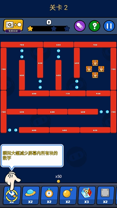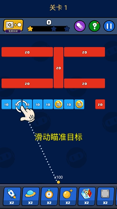 1、滑动屏幕瞄准目标,系统会自动释放小球,只有消除所有砖块,才能获得分数和星星,具体操作可参考图示