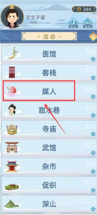 3、然后继续点击【活动】页面里的【媒人】功能,具体操作可参照图示;