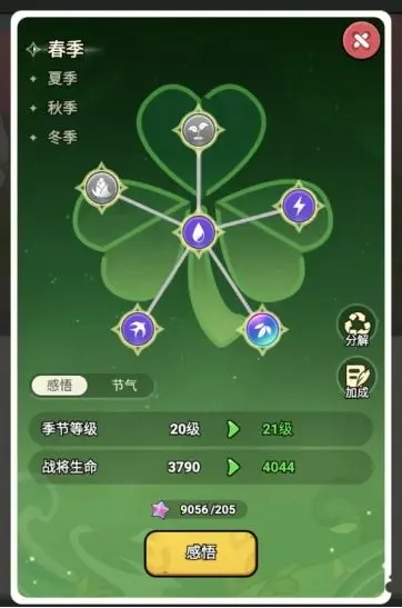 4、四季,开启四季只需要桃园等级提升至120级,配合70级开启的副本树洞奇兵。每个季节对应不同英雄的属性,收集节气徽章就可以点亮对应的图标,整体的收集进度决定了我们能给节气能提升的等级,一套图标是可以提升整体百分比属性的,多余的相同的节气图标可以消耗升级。