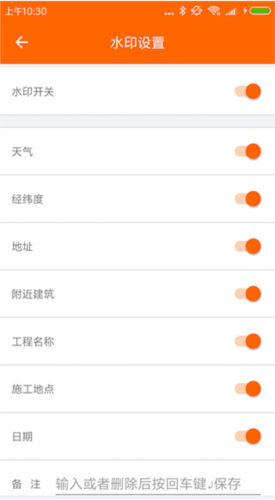 2、在“水印设置”中设置水印开关、天气、地点、经纬度、工程名称等等。