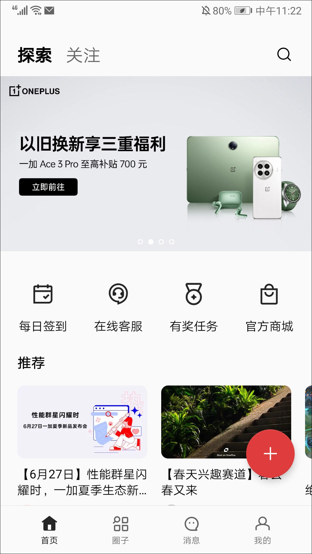 1、打开一加社区的手机客户端,进入首页后能看到丰富多样的服务功能;